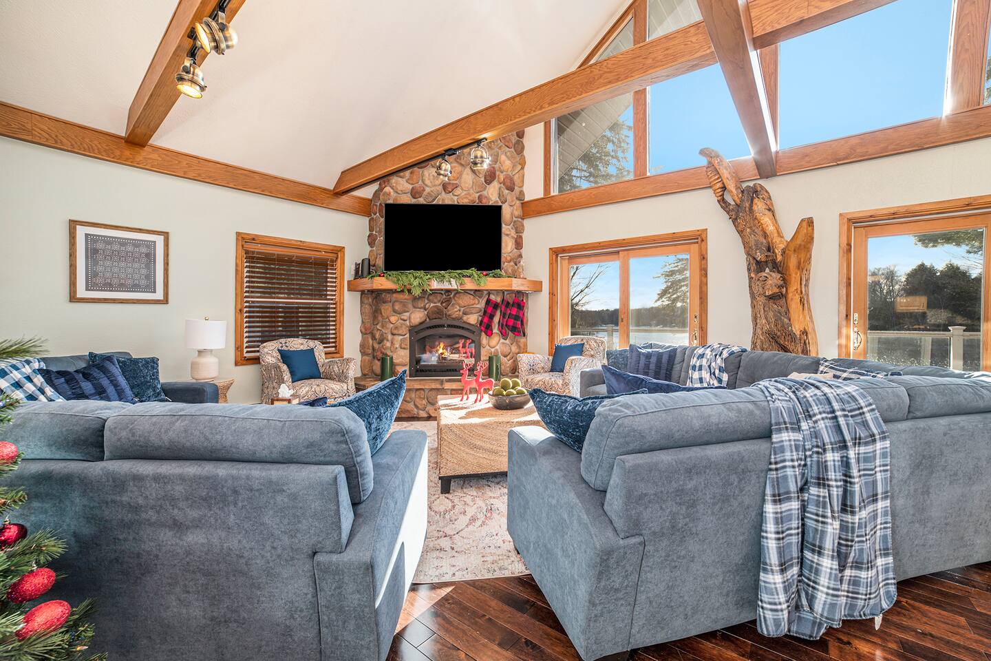 Escape to our elegantly updated lakefront house with 70 ft of private sandy beach, ideal for any season. 5 floors, 11 beds, 7K sqft, perfect for large groups. Enjoy luxe amenities: hot tub, barrel sauna, double decks, fire pit, 3 fireplaces, 2 kitchens, and diverse entertainment including board games, arcade machines, pool, foosball, dart, boats, kayaks, & exercise room w/ Peloton. Ideally situated for skiing, golfing, trails, dining & shopping. There is a cozy space with privacy for everyone!
