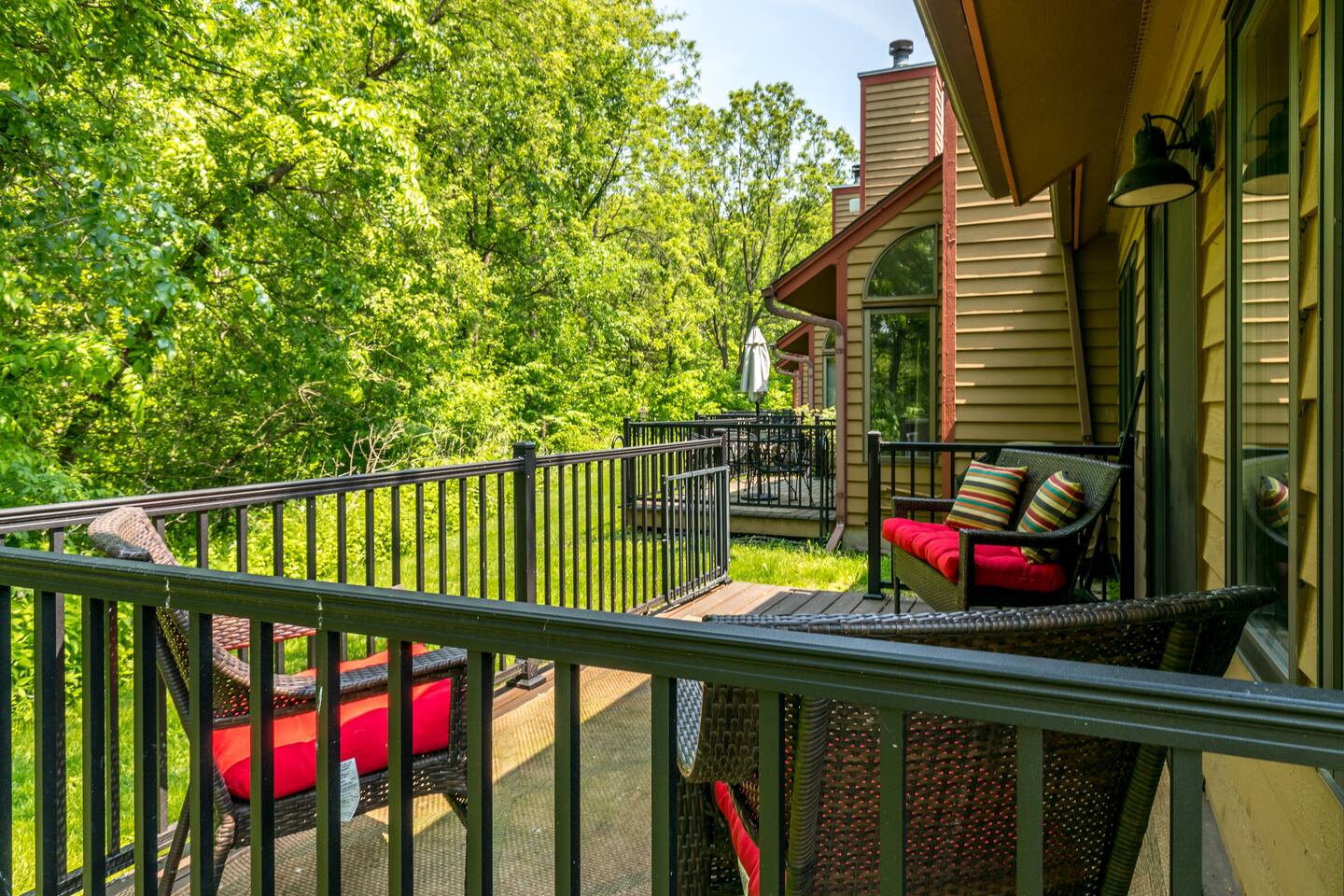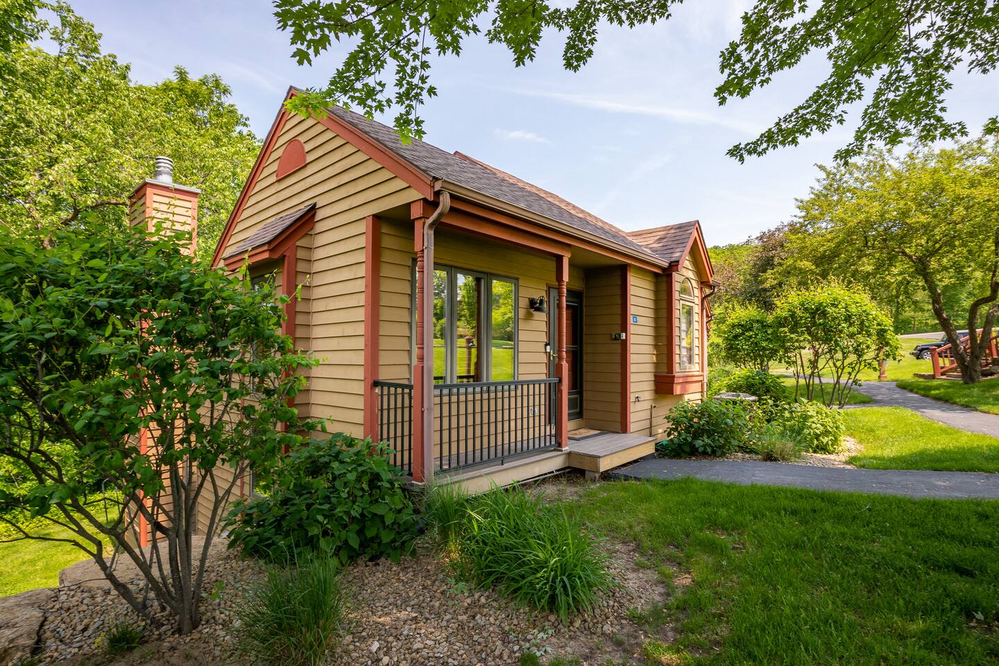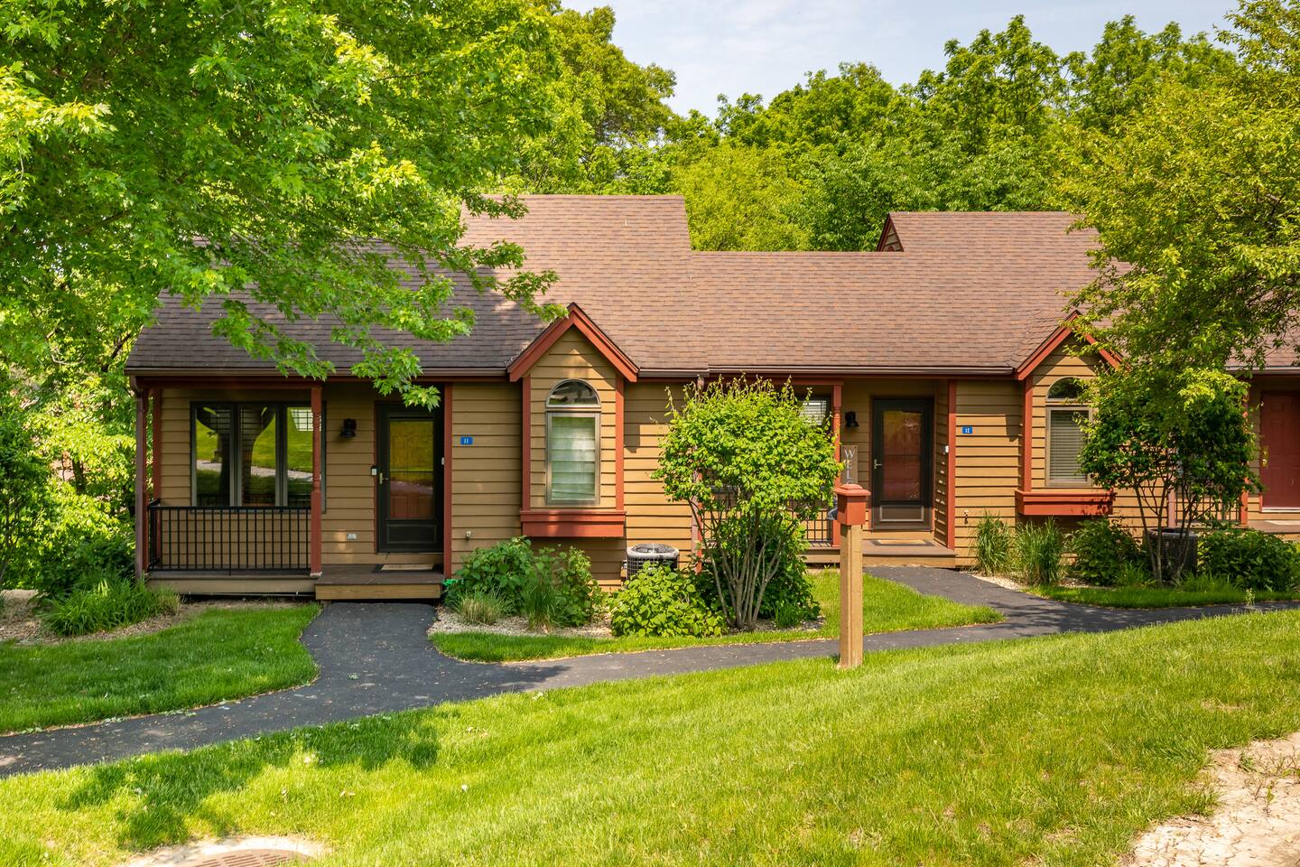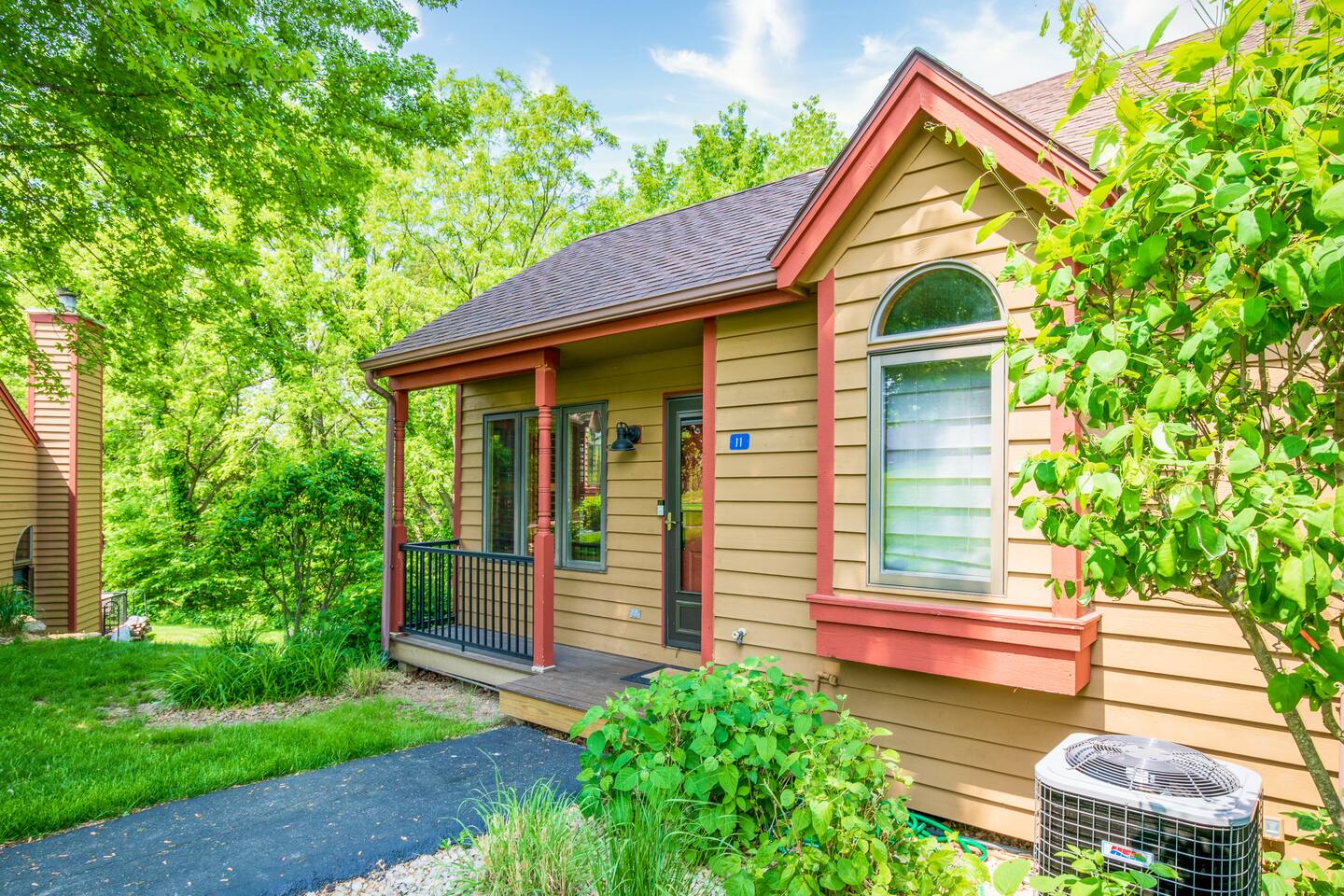 *Only 7 min drive to Galena Territory Owners Club and 12 min to downtown Galena. ***What sets us apart*** - 5-star hospitality - Response within minutes, not hours :) - Premium & sustainable personal care products from Public Goods - High cleaning standards - Quality and comfortable bedding and towels - A fully stocked kitchen, gas fireplace, board games, fast Wi-Fi, streaming-enabled TVs, and so much more - An unbeatable location to relax surrounded by nature or easily access the best of Galena Country The Oak Glen Country Townhome is a charming 1030 sq ft, two-level 2 bedroom, 2 bathroom home that offers a cozy space that comfortably sleeps 4 guests, with an additional pullout couch that can accommodate 2 additional guests. Each bedroom has its own en-suite bathroom. Sleeping Areas: we provide all linens and comfortable bedding. - BEDROOM 1 (main level): 1 queen bed, plus a closet, ceiling fan, direct access to the main floor bathroom, plus a Roku-enabled Sony smart TV - BEDROOM 2 (upper level): 1 king bed, plus a Roku-enabled Sony smart TV, closet, ceiling fan, private access to the upper floor bathroom - Pullout leather couch (main level): 1 queen bed Bathrooms: we provide plush towels (e.g., bath towel, hand towel, wash cloth, makeup towel) and premium, sustainable personal care products from Public Goods (e.g., shampoo, conditioner, body wash, lotion, hand soap). Separate pool towels are stored in the loft area. - BATHROOM 1: full bath - BATHROOM 2: full bath Kitchen: fully stocked with quality pots, pans, utensils, and spices plus a charcoal grill. We also provide an initial supply of Keurig coffee pods, ground coffee, creamer, tea, condiments (e.g., ketchup, mayo, mustard), trash bags, laundry detergent pods, etc. Longer stays or a large number of guests will need to bring extra. Entertainment: you can enjoy some of the most popular, family-friendly board games (e.g., Ticket to Ride, Monopoly, Uno, Jenga); 3 streaming enabled smart TVs in living room and both bedrooms; sound system support bluetooth music streaming. Living Room/Dining Area: enjoy a great open space with vaulted ceiling. Dinner area comfortably sits 6 guests. Cozy around for board games, movies, and conversations. Porch: comfy outdoor furniture plus a gas grill. Enjoy lounging outside under the umbrella, surrounded by lush green and beautiful bird singing. Parking: each reservation comes with 2 parking spots right in front of the unit. *For your and our safety, the home is equipped with a security camera near the entrance door facing the parking lot.