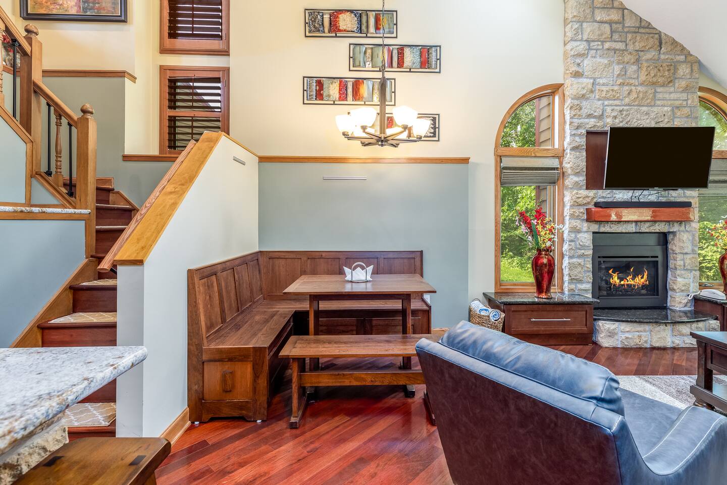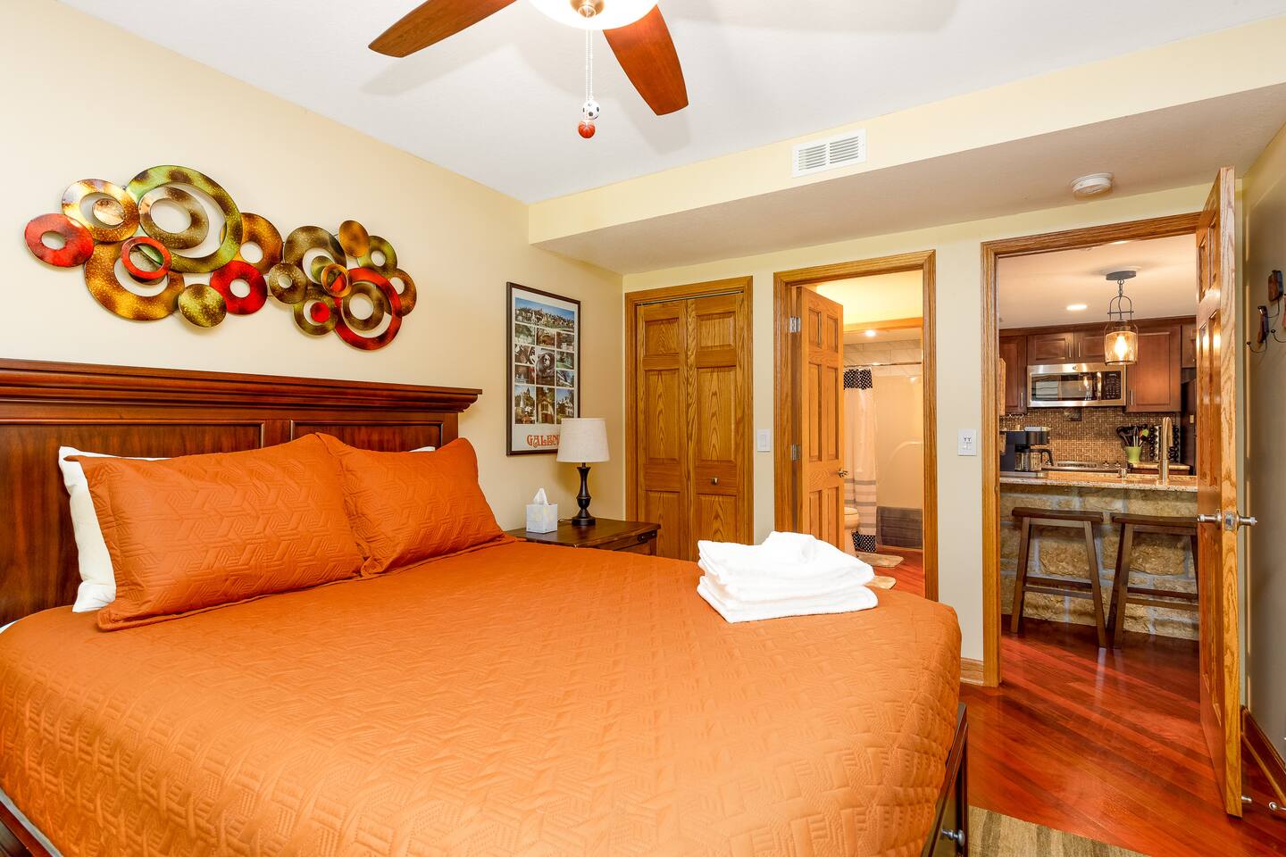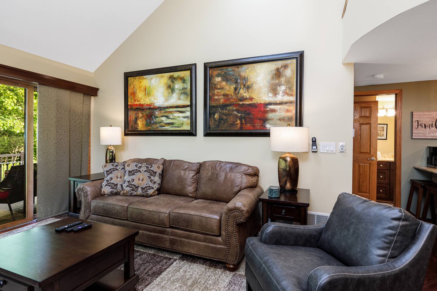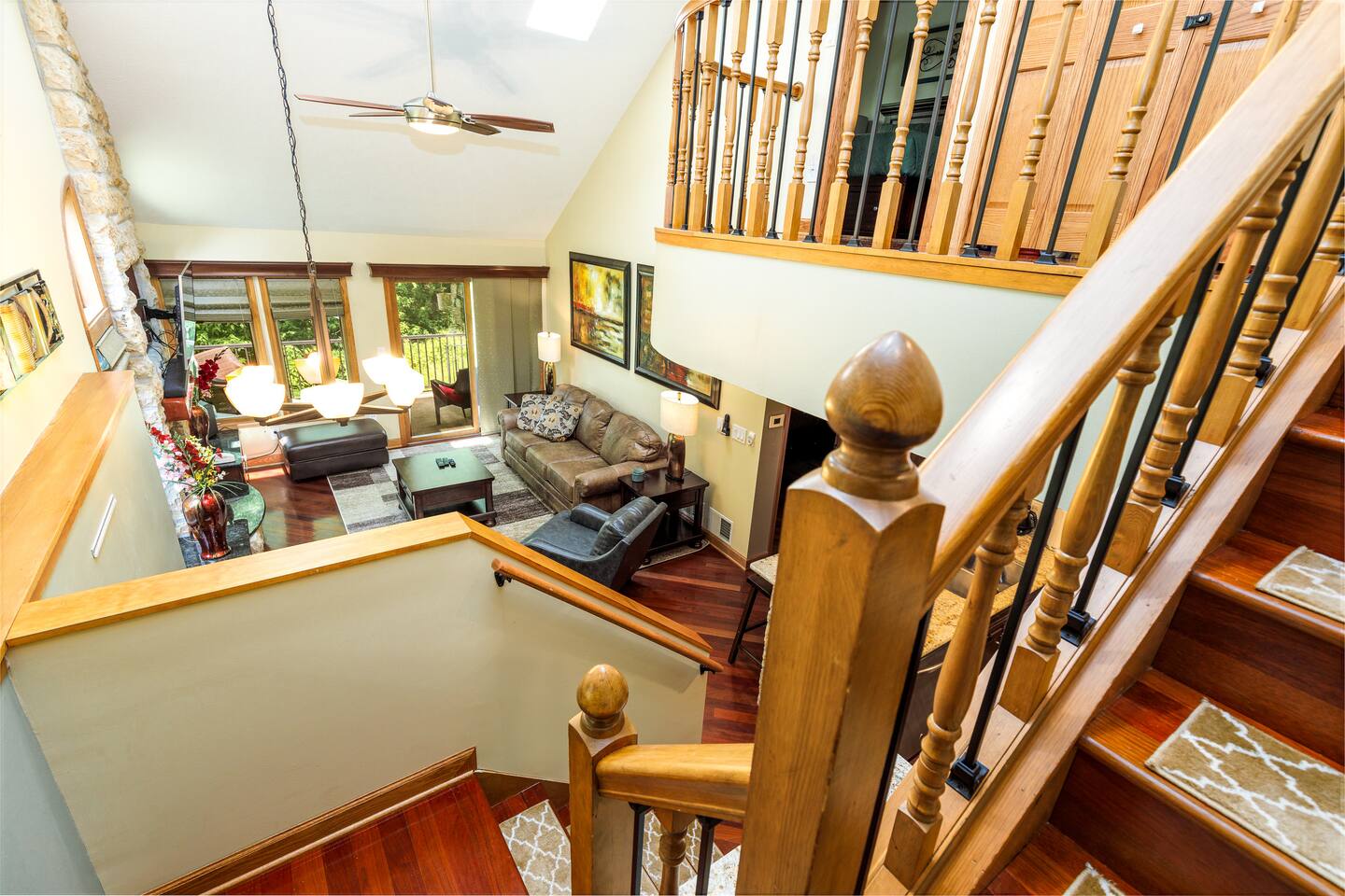 *Only 7 min drive to Galena Territory Owners Club and 12 min to downtown Galena. ***What sets us apart*** - 5-star hospitality - Response within minutes, not hours :) - Premium & sustainable personal care products from Public Goods - High cleaning standards - Quality and comfortable bedding and towels - A fully stocked kitchen, gas fireplace, board games, fast Wi-Fi, streaming-enabled TVs, and so much more - An unbeatable location to relax surrounded by nature or easily access the best of Galena Country The Oak Glen Country Townhome is a charming 1030 sq ft, two-level 2 bedroom, 2 bathroom home that offers a cozy space that comfortably sleeps 4 guests, with an additional pullout couch that can accommodate 2 additional guests. Each bedroom has its own en-suite bathroom. Sleeping Areas: we provide all linens and comfortable bedding. - BEDROOM 1 (main level): 1 queen bed, plus a closet, ceiling fan, direct access to the main floor bathroom, plus a Roku-enabled Sony smart TV - BEDROOM 2 (upper level): 1 king bed, plus a Roku-enabled Sony smart TV, closet, ceiling fan, private access to the upper floor bathroom - Pullout leather couch (main level): 1 queen bed Bathrooms: we provide plush towels (e.g., bath towel, hand towel, wash cloth, makeup towel) and premium, sustainable personal care products from Public Goods (e.g., shampoo, conditioner, body wash, lotion, hand soap). Separate pool towels are stored in the loft area. - BATHROOM 1: full bath - BATHROOM 2: full bath Kitchen: fully stocked with quality pots, pans, utensils, and spices plus a charcoal grill. We also provide an initial supply of Keurig coffee pods, ground coffee, creamer, tea, condiments (e.g., ketchup, mayo, mustard), trash bags, laundry detergent pods, etc. Longer stays or a large number of guests will need to bring extra. Entertainment: you can enjoy some of the most popular, family-friendly board games (e.g., Ticket to Ride, Monopoly, Uno, Jenga); 3 streaming enabled smart TVs in living room and both bedrooms; sound system support bluetooth music streaming. Living Room/Dining Area: enjoy a great open space with vaulted ceiling. Dinner area comfortably sits 6 guests. Cozy around for board games, movies, and conversations. Porch: comfy outdoor furniture plus a gas grill. Enjoy lounging outside under the umbrella, surrounded by lush green and beautiful bird singing. Parking: each reservation comes with 2 parking spots right in front of the unit. *For your and our safety, the home is equipped with a security camera near the entrance door facing the parking lot.