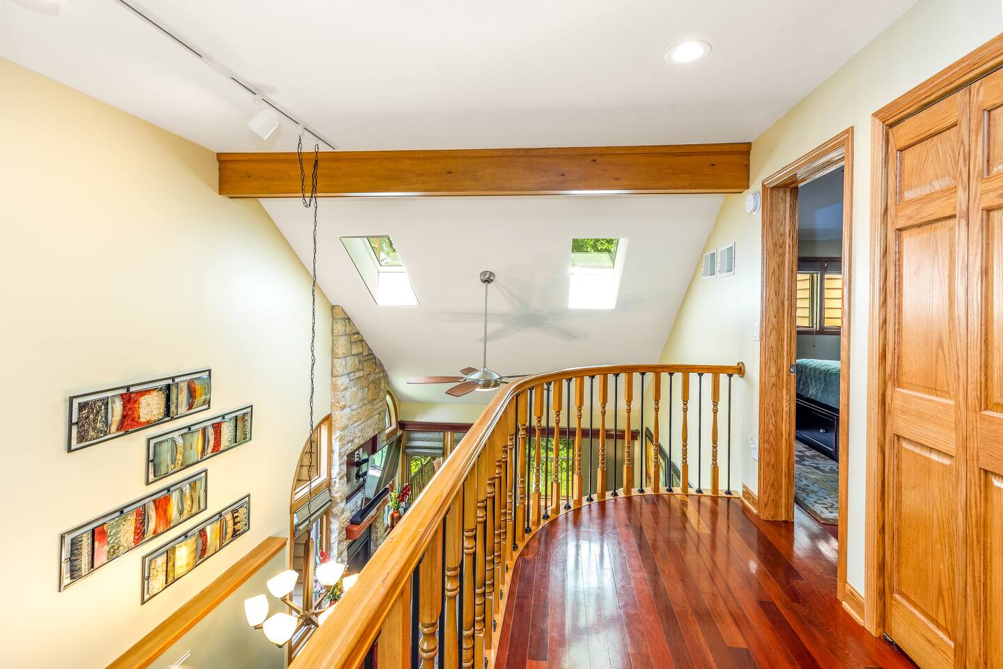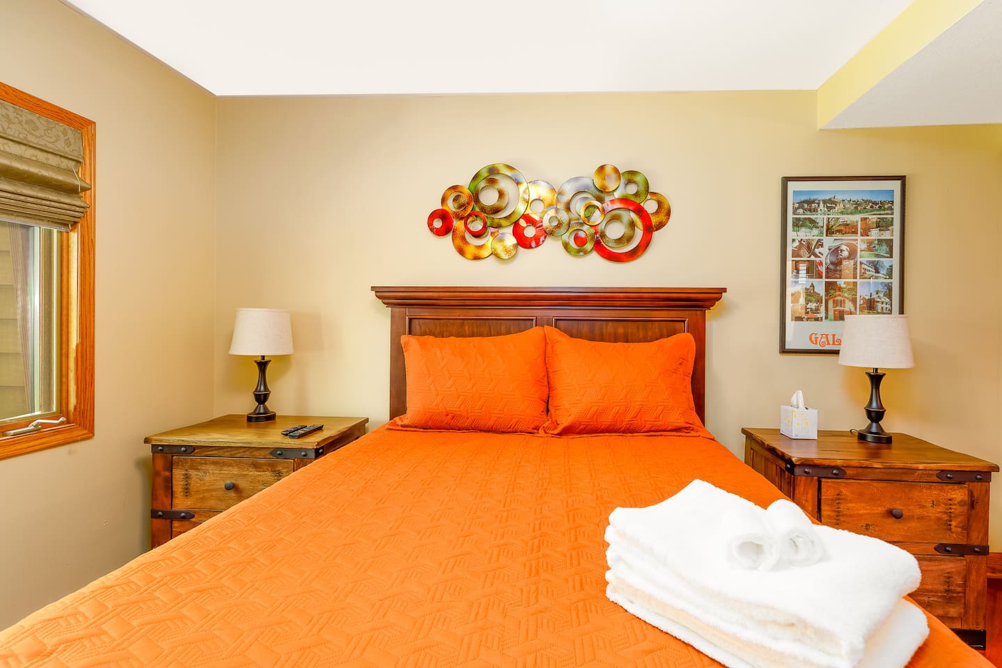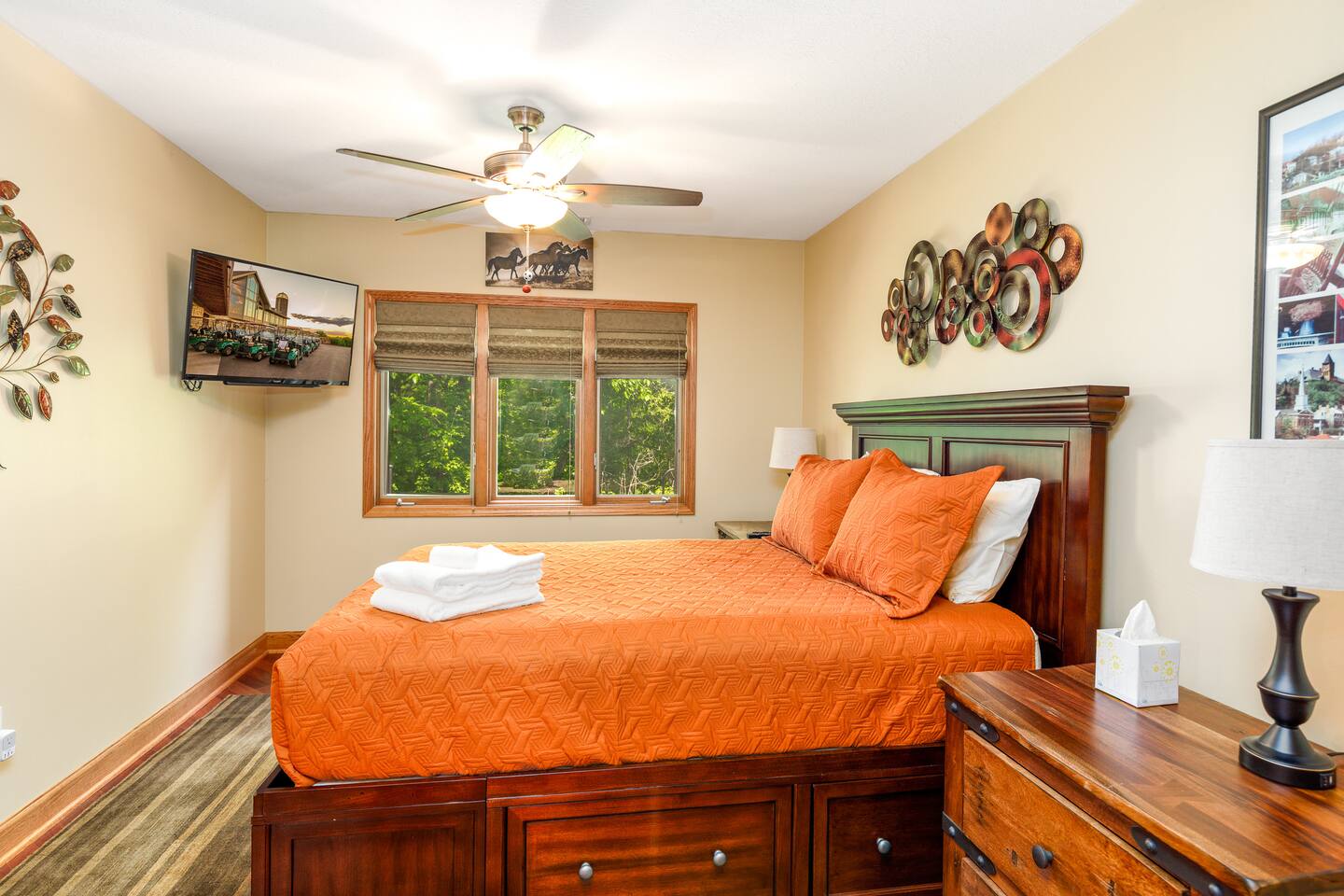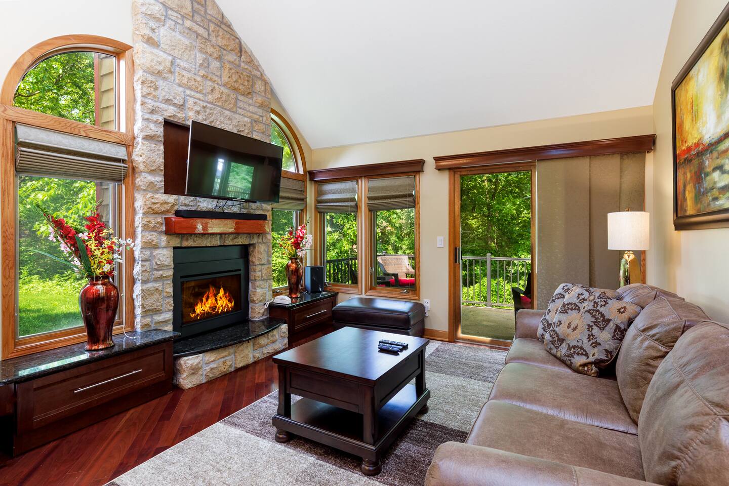 *Only 7 min drive to Galena Territory Owners Club and 12 min to downtown Galena. ***What sets us apart*** - 5-star hospitality - Response within minutes, not hours :) - Premium & sustainable personal care products from Public Goods - High cleaning standards - Quality and comfortable bedding and towels - A fully stocked kitchen, gas fireplace, board games, fast Wi-Fi, streaming-enabled TVs, and so much more - An unbeatable location to relax surrounded by nature or easily access the best of Galena Country The Oak Glen Country Townhome is a charming 1030 sq ft, two-level 2 bedroom, 2 bathroom home that offers a cozy space that comfortably sleeps 4 guests, with an additional pullout couch that can accommodate 2 additional guests. Each bedroom has its own en-suite bathroom. Sleeping Areas: we provide all linens and comfortable bedding. - BEDROOM 1 (main level): 1 queen bed, plus a closet, ceiling fan, direct access to the main floor bathroom, plus a Roku-enabled Sony smart TV - BEDROOM 2 (upper level): 1 king bed, plus a Roku-enabled Sony smart TV, closet, ceiling fan, private access to the upper floor bathroom - Pullout leather couch (main level): 1 queen bed Bathrooms: we provide plush towels (e.g., bath towel, hand towel, wash cloth, makeup towel) and premium, sustainable personal care products from Public Goods (e.g., shampoo, conditioner, body wash, lotion, hand soap). Separate pool towels are stored in the loft area. - BATHROOM 1: full bath - BATHROOM 2: full bath Kitchen: fully stocked with quality pots, pans, utensils, and spices plus a charcoal grill. We also provide an initial supply of Keurig coffee pods, ground coffee, creamer, tea, condiments (e.g., ketchup, mayo, mustard), trash bags, laundry detergent pods, etc. Longer stays or a large number of guests will need to bring extra. Entertainment: you can enjoy some of the most popular, family-friendly board games (e.g., Ticket to Ride, Monopoly, Uno, Jenga); 3 streaming enabled smart TVs in living room and both bedrooms; sound system support bluetooth music streaming. Living Room/Dining Area: enjoy a great open space with vaulted ceiling. Dinner area comfortably sits 6 guests. Cozy around for board games, movies, and conversations. Porch: comfy outdoor furniture plus a gas grill. Enjoy lounging outside under the umbrella, surrounded by lush green and beautiful bird singing. Parking: each reservation comes with 2 parking spots right in front of the unit. *For your and our safety, the home is equipped with a security camera near the entrance door facing the parking lot.